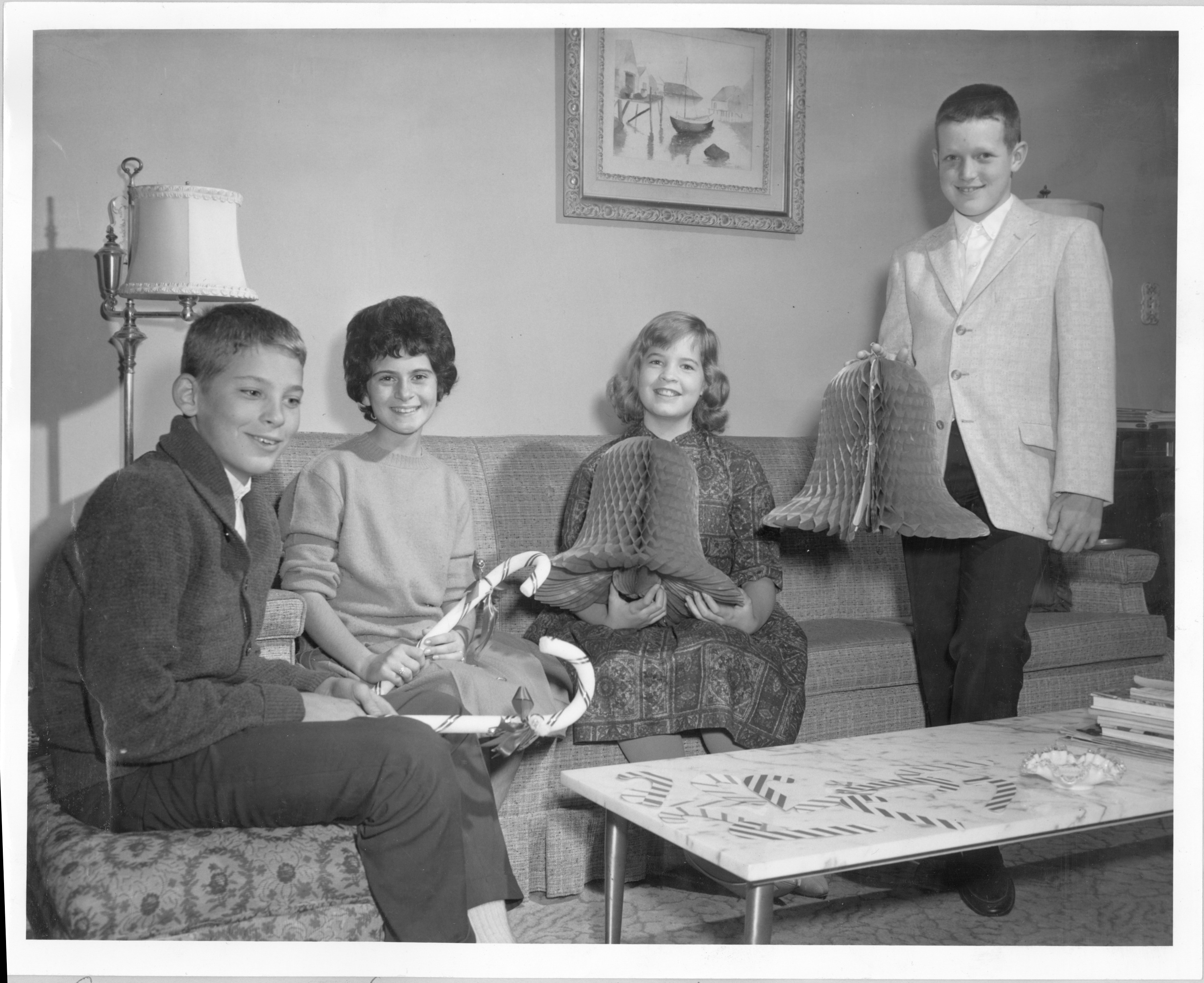 Shown in this photograph (left to right) are Rob Carter, Valerie Chakeres, Judy Meloy, and John McLaughlin looking at decorations for the 1962 Candy Cane Ball, sponsored by the Activity Club. Students in grades 5-9 who participated in social dancing classes arranged by the Activity Club celebrated the end of the ten week series of lessons with a dance party held in December.