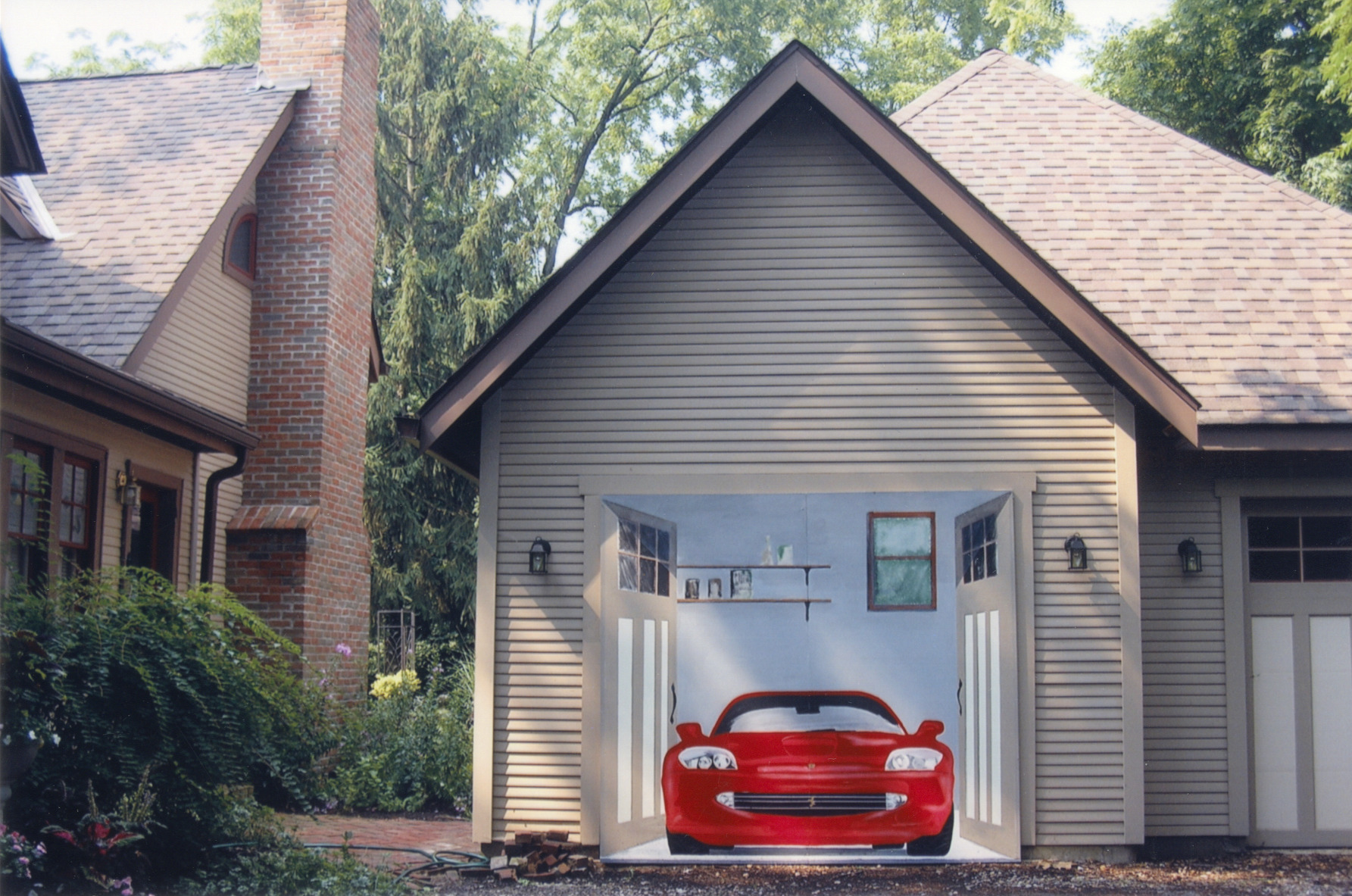 These photographs show a painting made by artist and signmaker William (bc) (Bill) Collins of a red Porsche car on the garage of 180 West South Street. bc, who lived at the address with his family for 22 years, had a particular interest in cars; the painting was designed to give the illusion of having a Porsche in the garage.