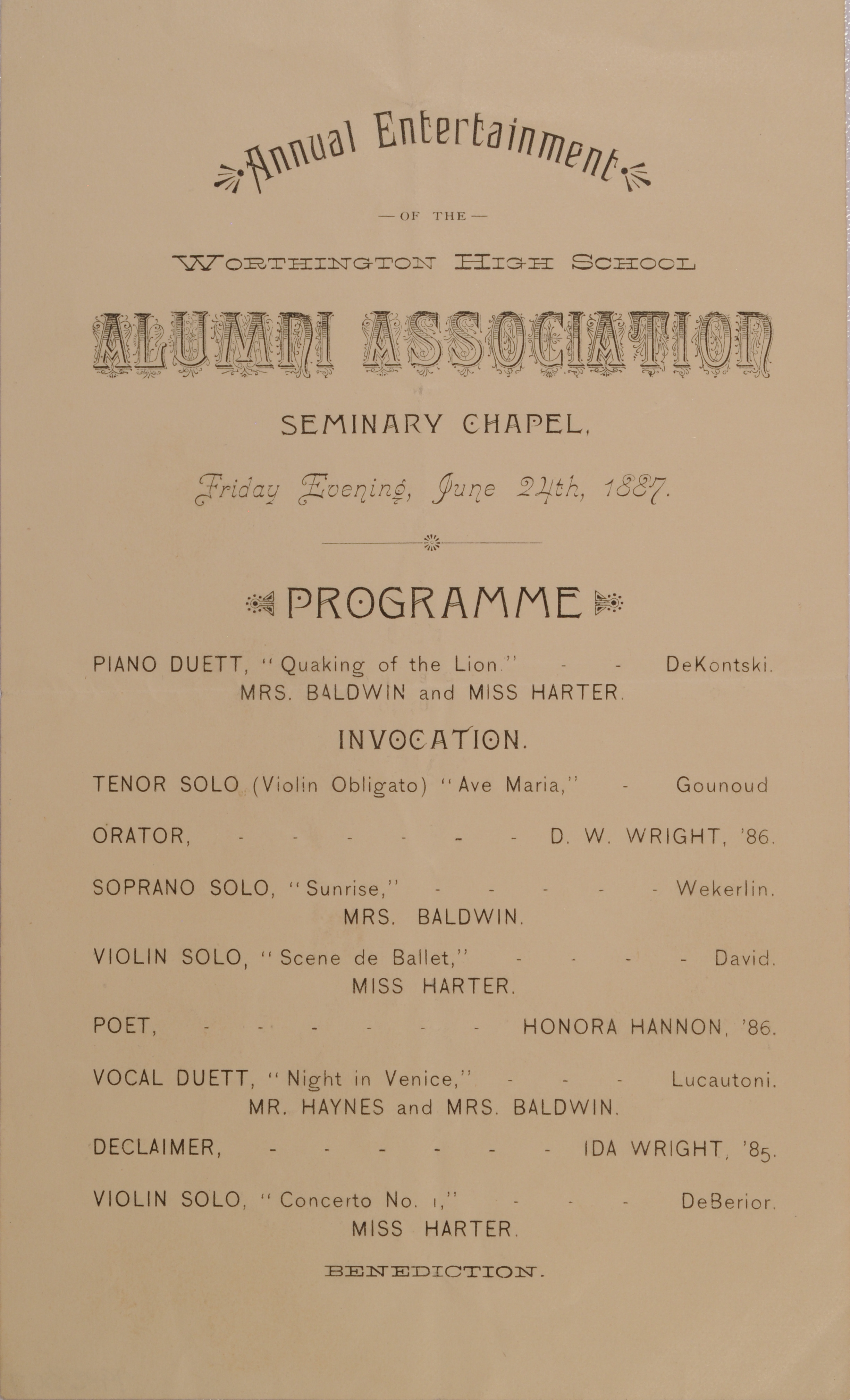 This is a program for the Annual Entertainment of the Worthington High School Alumni Association which was held in the Seminary Chalep on June 24th, 1887. The program included music by Mrs. Baldwin, Miss Harter and Mr. Haynes. Alumni who spoke included D. W. Wright and Honora Hannon, both of the class of 1886 and Ida Wright, from the class of 1885.