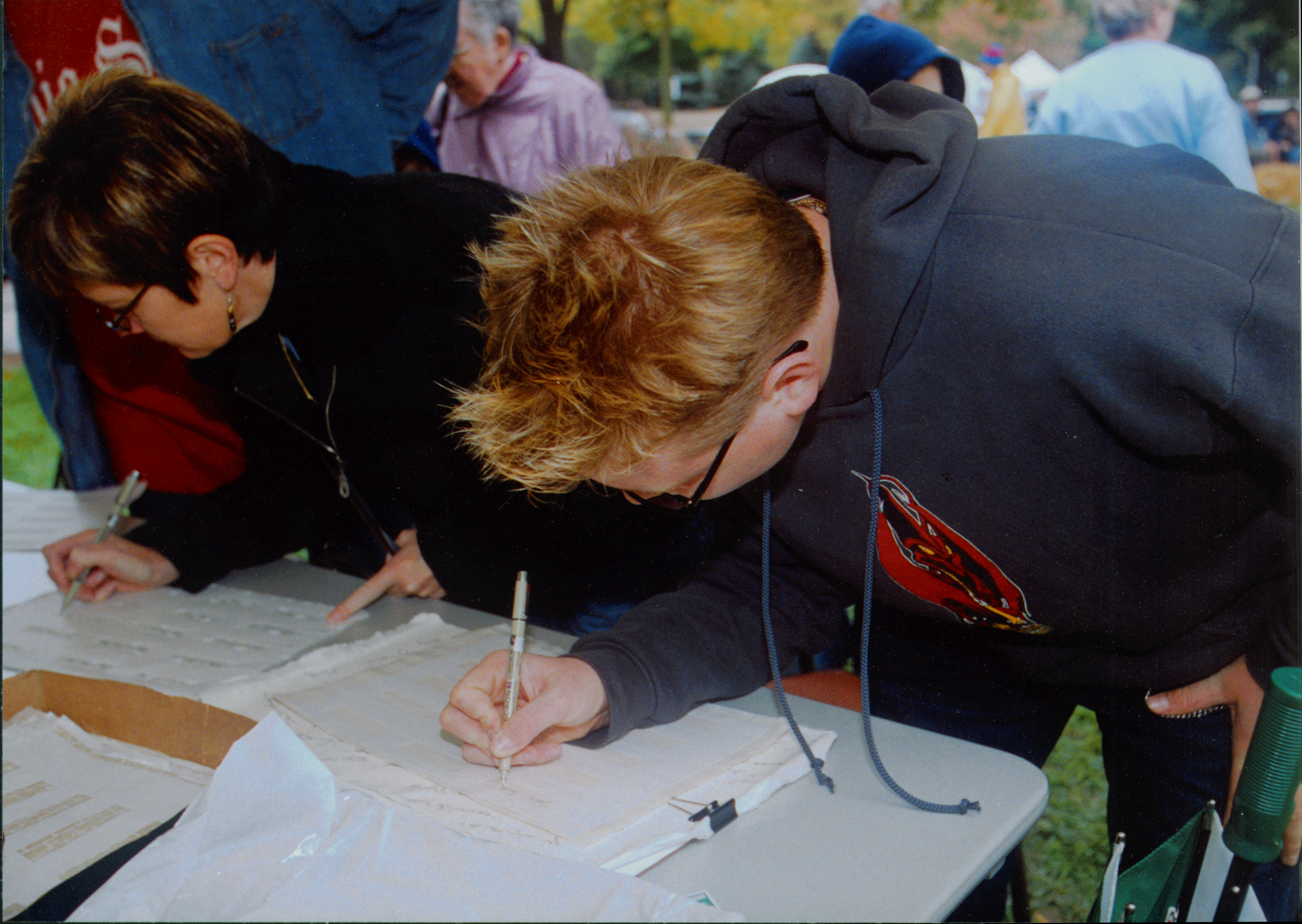 Members of the community sign swatches of fabric to be incorporated into the Worthington Bicentennial Legacy Quilt, which was created by a group of seventeen Worthington women and presented to the City of Worthington in 2003. The quilt makers collected hundreds of signatures at the Founders Day Festival 2002. The quilt incorporated the signed pieces of fabric in between 25 quilt blocks.