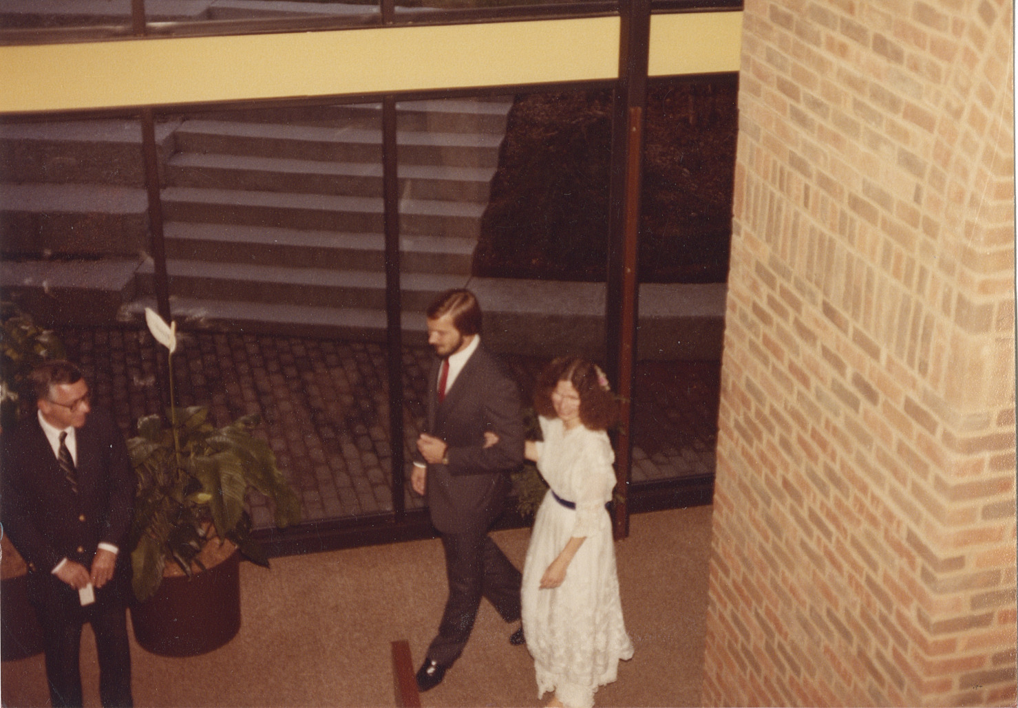 At the time, the Old Worthington Library was the only location of Worthington Libraries. The wedding took place that Saturday night, after the library closed, with food contributed by library staff. The view is taken from the main floor looking down at the landing. Following a building renovation, the space at the top of the photo is now occupied by a portion of the library's children's department.