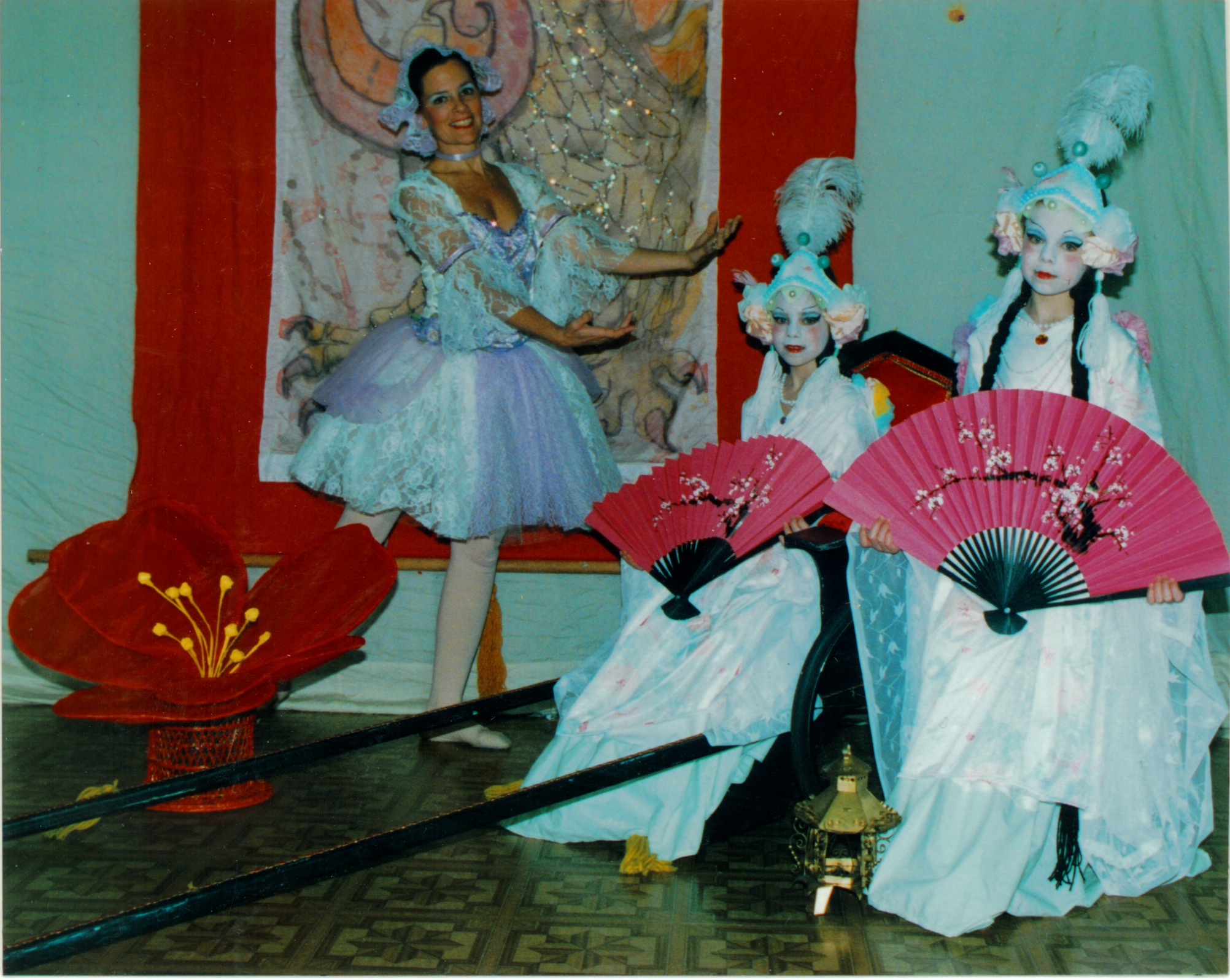 Following a performance of "The Red Poppy" ballet, the junior and senior companies of the Worthington Civic Ballet performed "Mozart's Clarinet Concerto, 3rd Movement". Appearing in this photograph are (left to right) Barbara Burrows, Tiffany McCash and Amanda McCash. Miss Burrows is depicted in a Louis XIV court costume, worn by dancers of the Mozart's Clarinet Concerto, and the McCash sisters wore Royal Court Ladies of the Princess costumes from the Red Poppy. The elaborate costumes and props were researched, designed, and created by Miss Burrows.