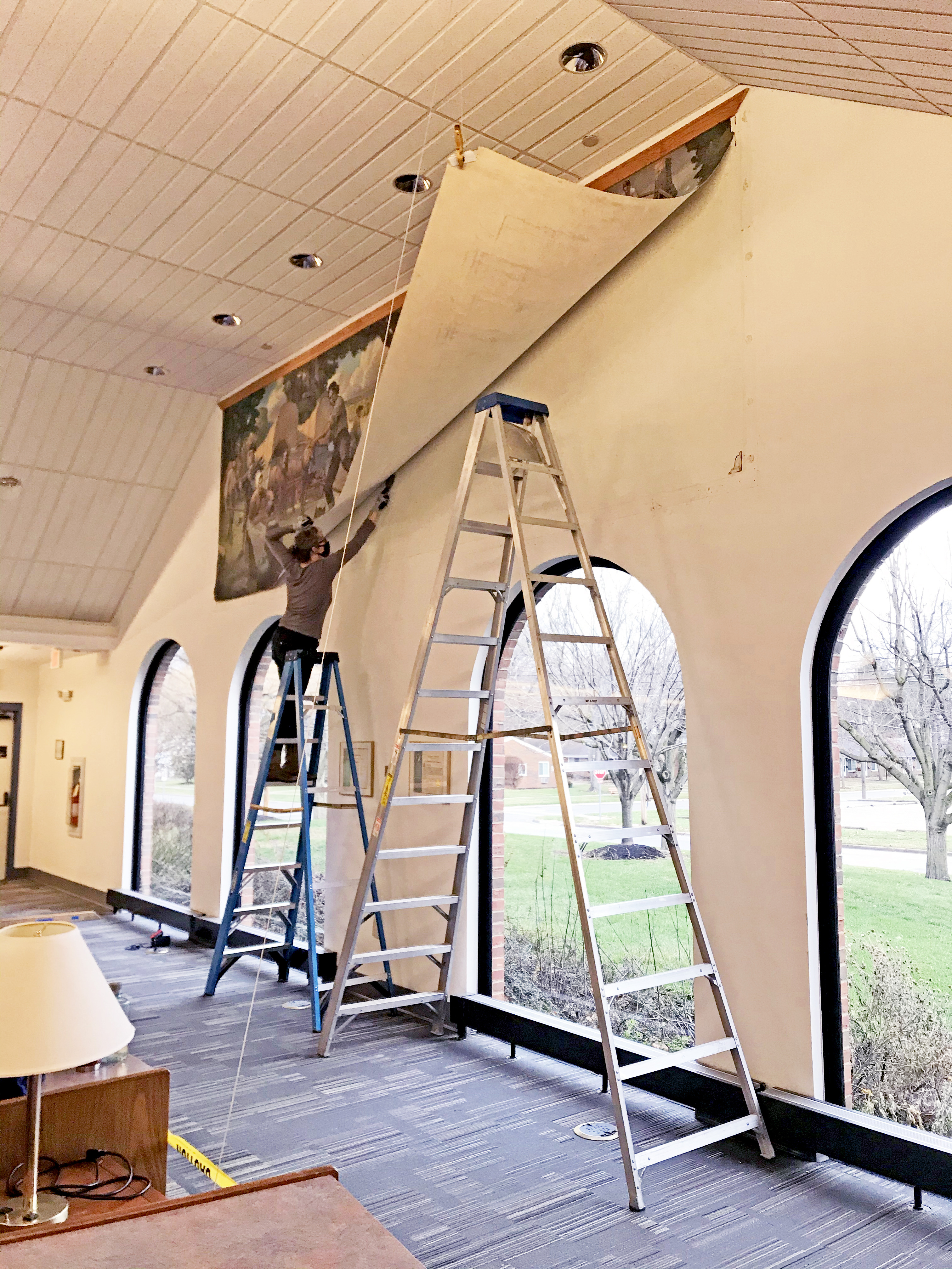 These photographs show Melanie Holm taking down the centerpiece from the Founding of Worthington mural from where it had hung in the Old Worthington Library for over 20 years. Assisting with the removal but not pictured was her husband, David Holm, an exhibitions preparator at the Columbus Museum of Art. The painting, which measures 6 feet by 20 feet, was installed at the City National Bank for its grand opening in March, 1963, along with two other endpiece paintings, each 6 feet by 10 feet. The bank, which eventually merged with JP Morgan Chase, stood at the corner of Broadmeadows Boulevard and High Street just south of Worthington’s city limits. When the bank was torn down, the entire mural became the property of the Worthington Historical Society and was placed on permanent loan to the Old Worthington Library, where it was displayed for more than 20 years. The endpieces and the centerpiece (pictured here) were displayed on the east and west walls of the "popular library"--the main reading room on the library's upper level.
