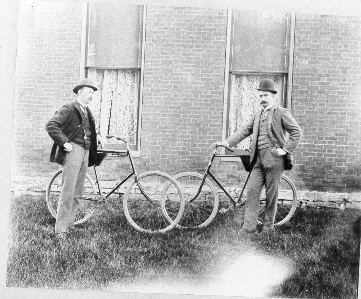 This photograph depicts Rufus Weaver (left) and Harry Leasure (right) with bicycles. Rufus Weaver was an accountant and lived in the house in the background. The house is known as the Buttles-Pinney-Brown House (a k a Sidney Brown House) at 12 East Stafford Avenue. Harry Leasure was a druggist in Worthington whose shop was located at 693 High Street for many years.