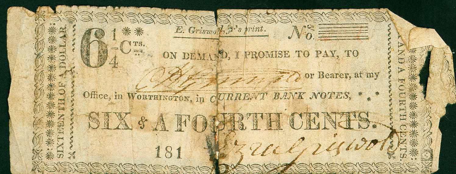 This scrip note was issued by Scioto Company Proprietor, Ezra Griswold. Hard currency, such as gold coinage, was the preferred method of exchange, but cash was scarce on the frontier. In 1815, specie payment was suspended by eastern banks. Thus cash was in short supply on the frontier. Local banks and local businessmen like the Griswolds would issue their own paper currency called 'shinplasters" in small denominations. These were usually for small amounts, and helped keep local economies alive, as did the practice of barter.