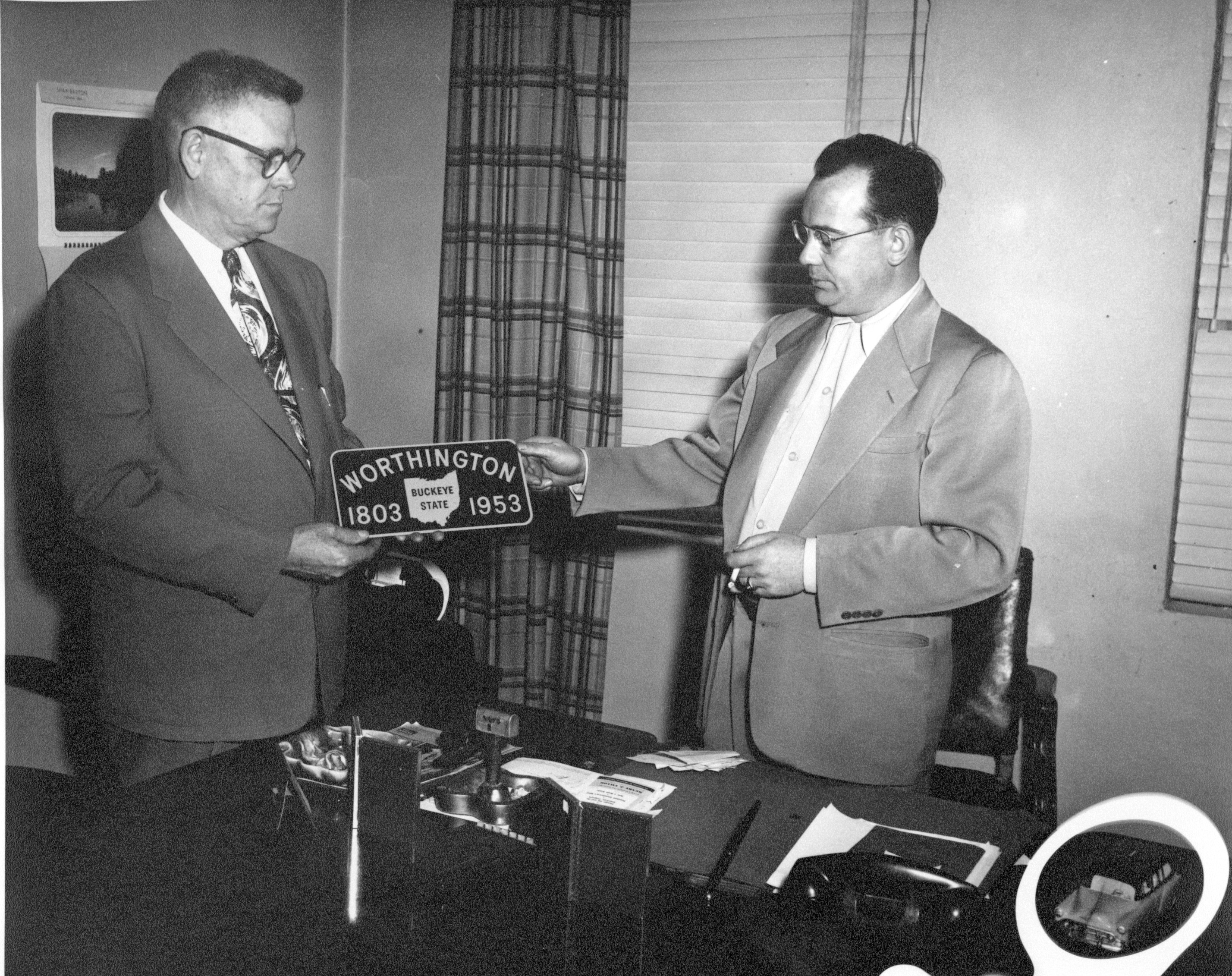 Vance Smith (b. 1892, d. 1965), Chairman of the Worthington Sesquicentennial Executive Committee, is pictured with committee member Mahlon Maxton (b. 1921, d. 1967). They are posing for the photograph with the special license plate commemorative for the Worthington Sesquicentennial celebrated in 1953. Vance Smith had a 44 year long career in schools, having served at one time as Worthington Schools superintendent, as church school superintendent for Worthington Presbyterian Church and as principal of Indianola Junior High School. Mahlon Maxton was owner of Maxton Chevrolet in Worthington. He was a veteran of World War II and active member of many organizations including (Ohio) Lodge F&AM, Worthington Shrine Club, Leasure-Blackston Post 239 among others.