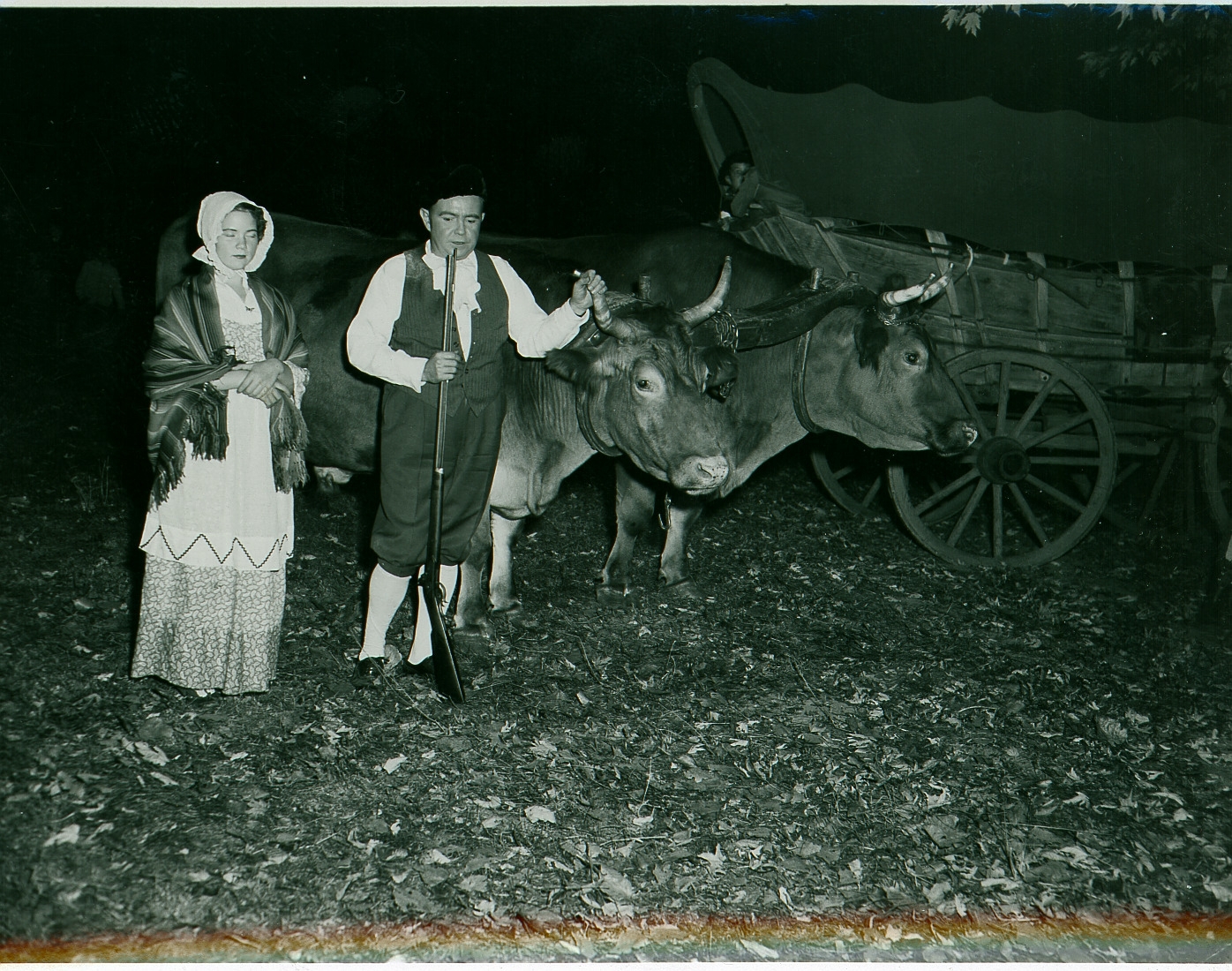 Two cast members of the "Whetstone Venture," Gayle and Albert Proudley, are pictured here. The historical pageant, performed by a cast of more than one hundred men, women and children from the community, was part of the Worthington Sesquicentennial celebration of 1953. Albert played the role of pioneer Ezra Griswold.