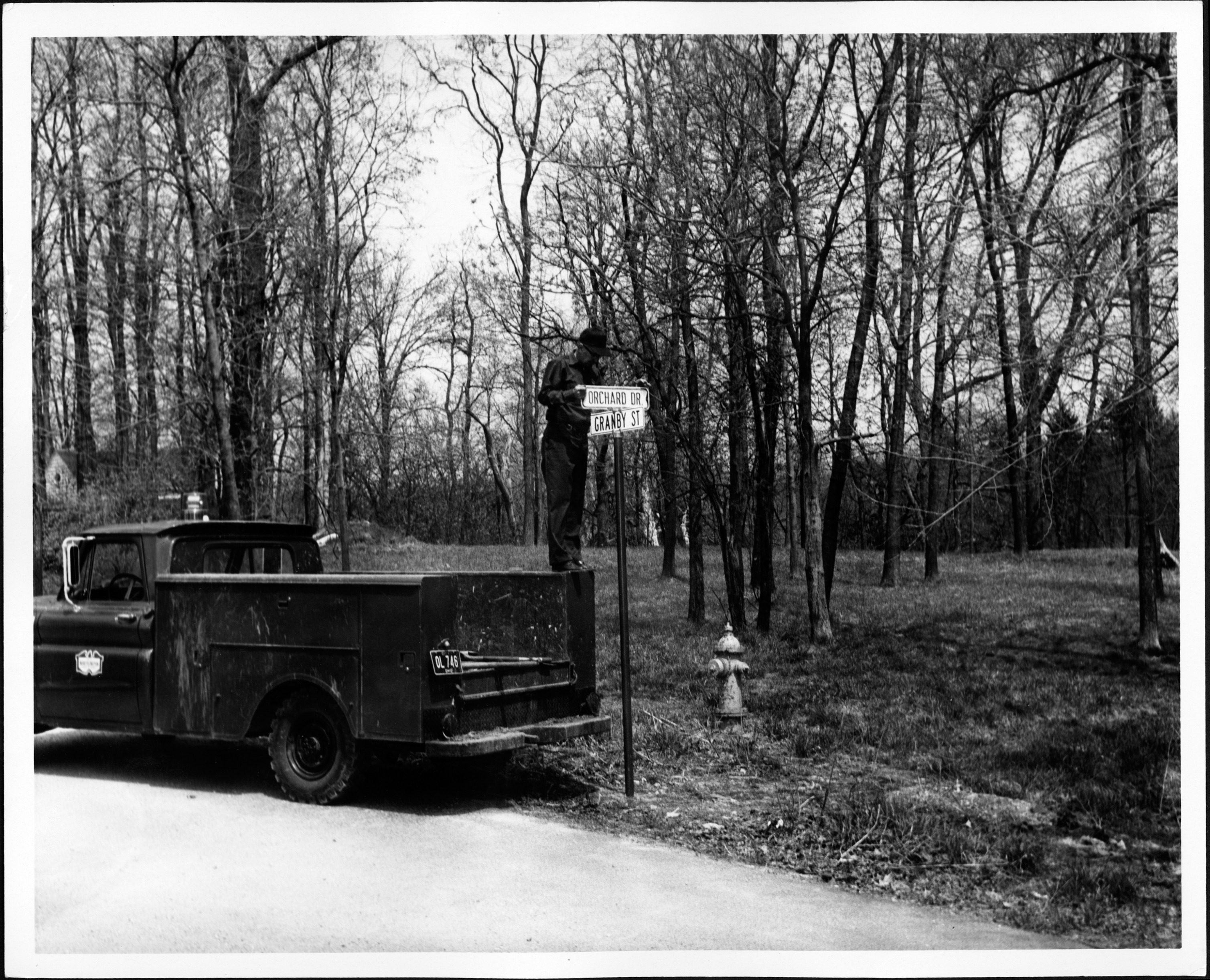 An employee of Worthington's Department of Public Service is shown maintaining street signs at Orchard Drive and Granby Street.
