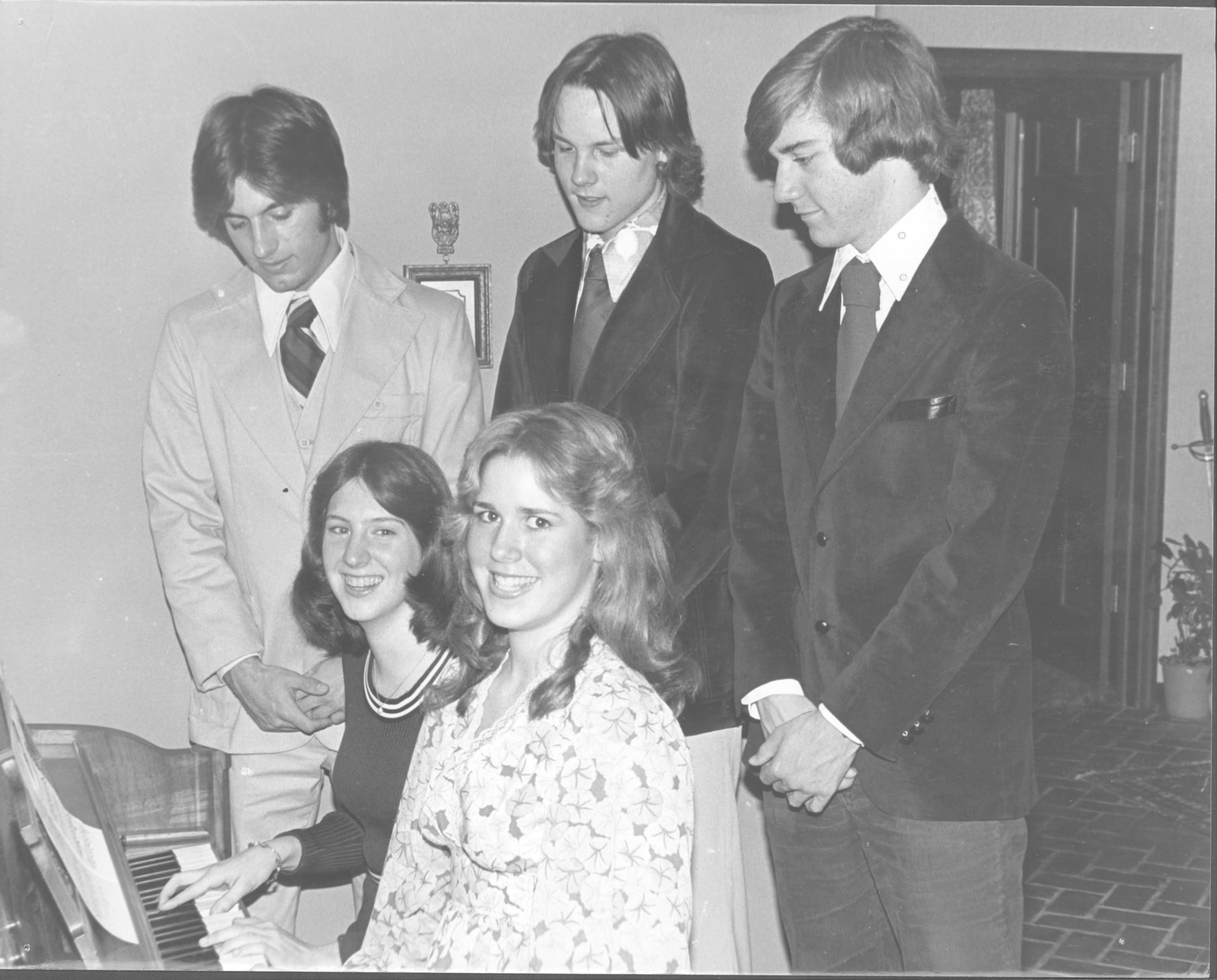 A few of the 1976 Spring Fling models are pictured here (front) Margie Maddox, Tori Jones, (back) Bruce Burkman, Jim Long, and Jeff Knight. The Spring Fling was a style show held prior to the Worthington High School prom. It was organized and sponsored by the Activity Club.