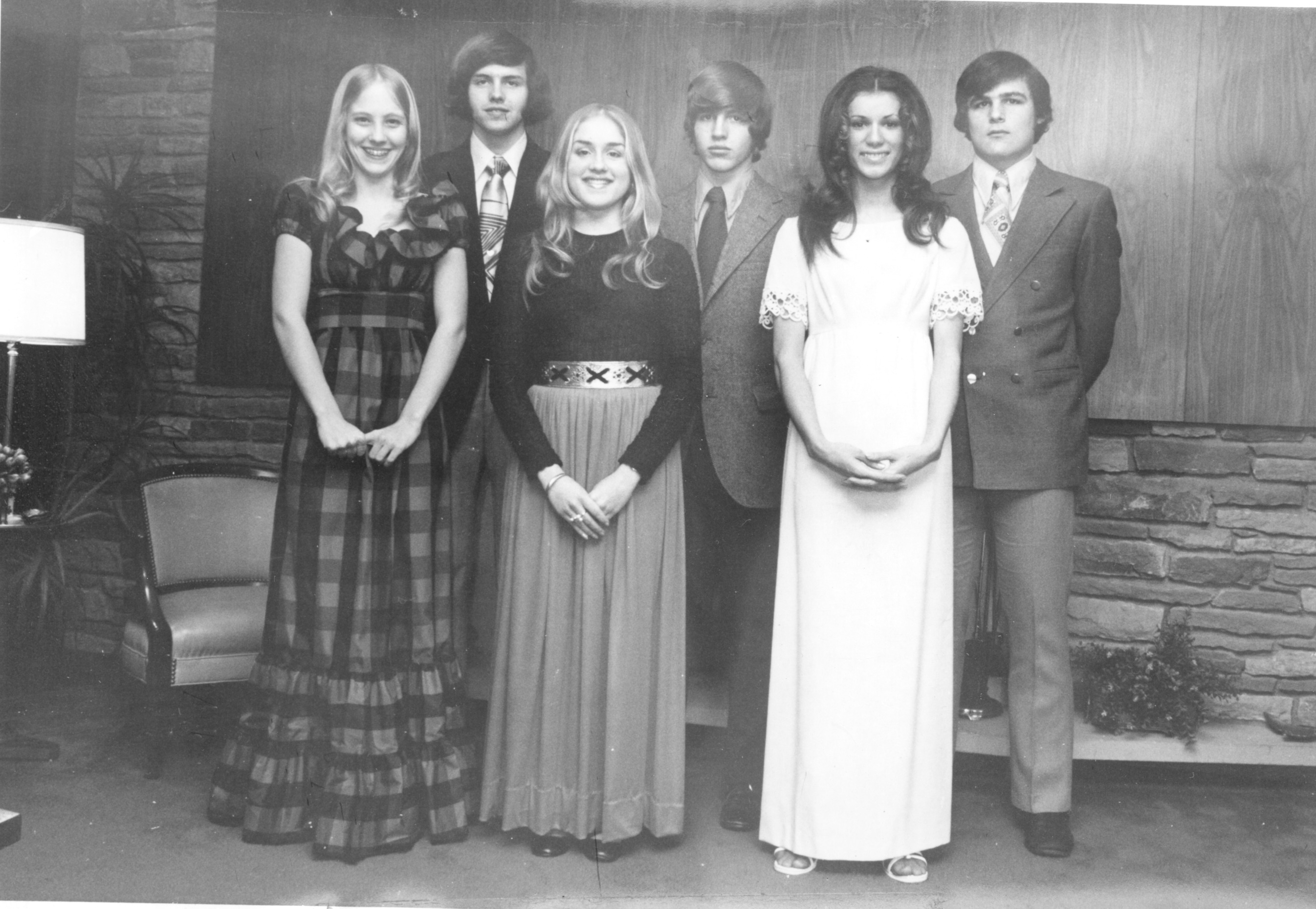 Worthington High School students are pictured modeling prom fashions for the 1972 Spring Fling pre-prom style show sponsored by the Activity Club. Models shown here are (left to right) Becky Brightman, Mark Pflieger, Candy Jones, Ric Frost, Patti Knight, and Steve Wood. Other student models who participated in the style show were Susan Brooks, Cathy Crystal, John McConnell, John Madry, Dan O'Rourke, Lisa Reed, Karen Scott, Randy Vosler, Jean Warburton and Bob Williams. The Spring Fling presented prospective prom goers with ideas for formal wear and prom night entertaining. Fashions for the style show were supplied by Smith-Stevens of Worthington and C.J. Wilsons of Delaware.