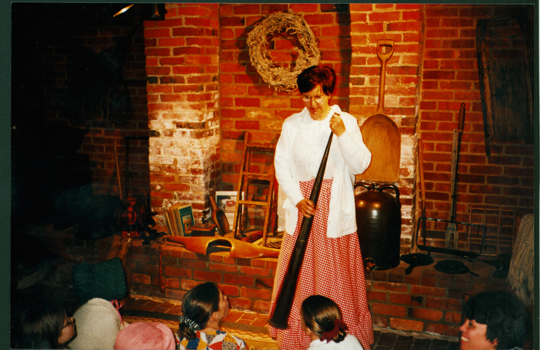Jutta Pegues, Docent and President of the Worthington Historical Society Board of Trustees, is pictured during a Third Grade Week local history program at the Orange Johnson House Museum. All third grade students in the Worthington School District participate in Third Grade Days annually, visiting the Orange Johnson House Museum to enhance their understanding of early pioneer life in Worthington and Ohio.