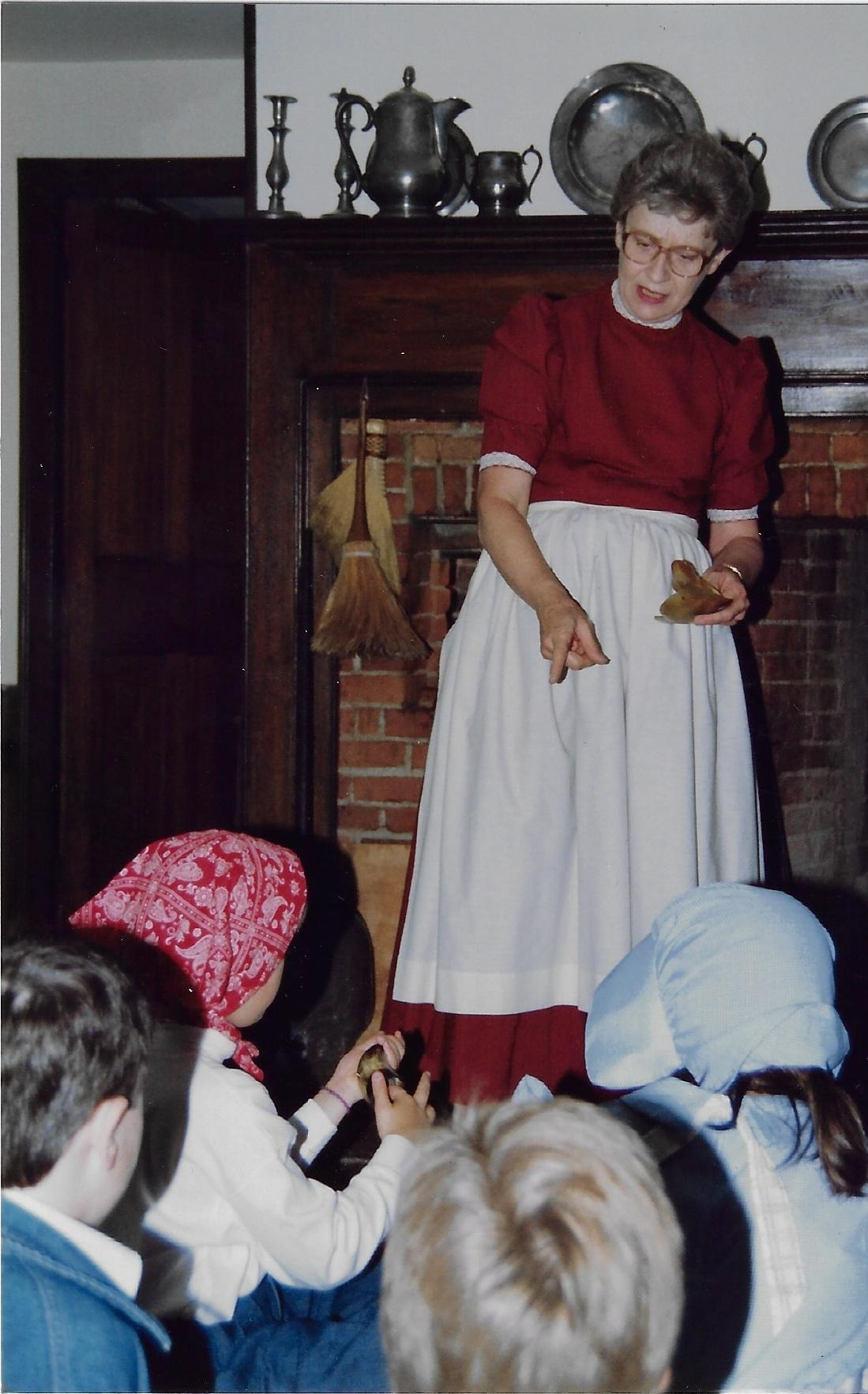 Virginia (Jennie) McCormick, docent at the Worthington Historical Society's Orange Johnson House, is seen here talking to third grade students as part of "Third Grade Weeks" or "Pioneer Days." Each year, the Historical Society hosts all of the third grade classes in the Worthington School District during the month of May for a field trip that includes a visit to the house museum. Here Jennie is standing in front of the cooking fireplace in the home's 1811 kitchen, holding a horn scoop similar to that which could have been made by the homeowner from 1816 to 1862, hornsmith Orange Johnson.