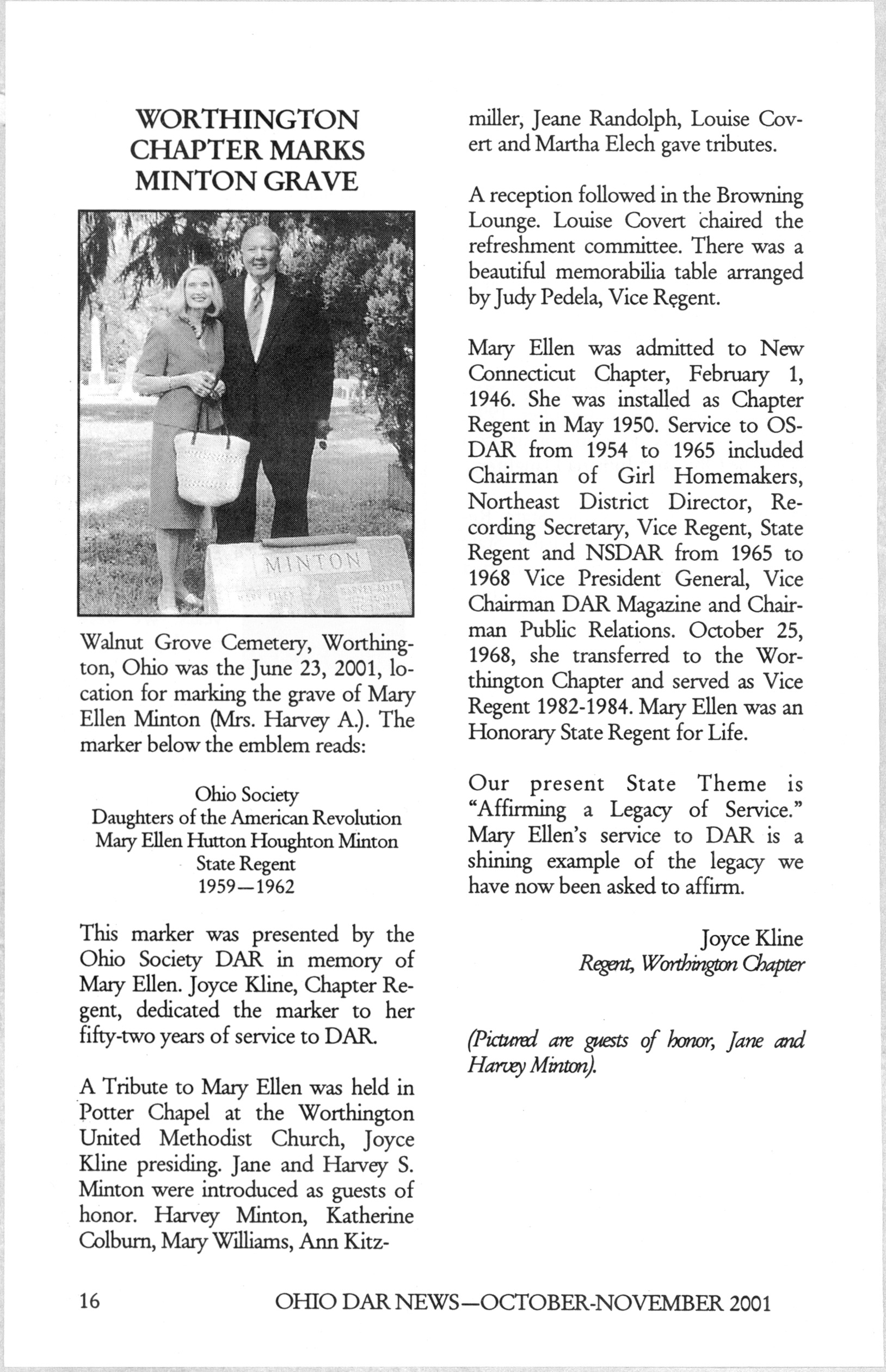 A marker was dedicated to Mary Ellen Minton's fifty-two years of service to the Daughters of the American Revolution in June 2001. The marker was presented by the Ohio Society DAR at Walnut Grove Cemetery. A tribute and reception followed. This article published in the Ohio DAR News provides details of Minton's involvement with the DAR and the marker dedication. Pictured are Jane and Harvey S. Minton at the grave site.
