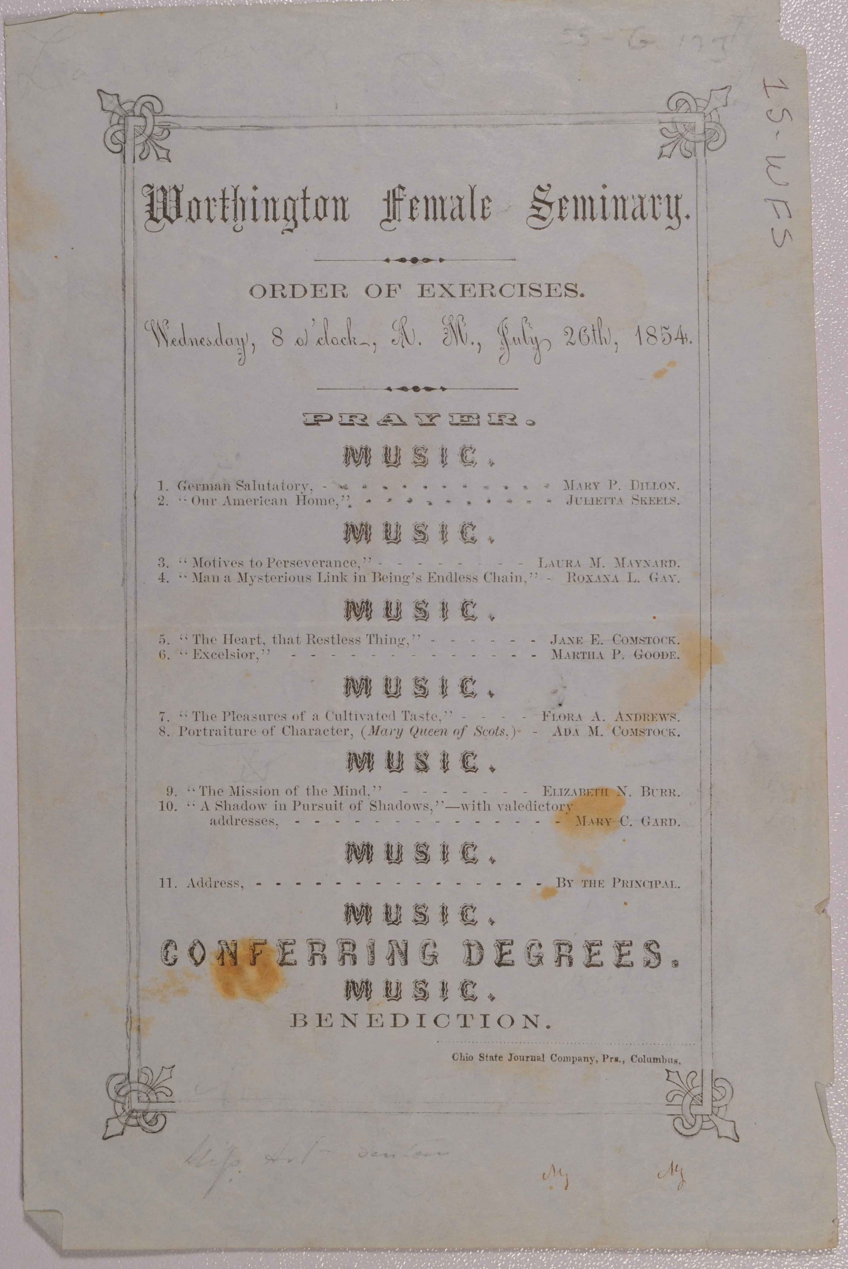 This program from 1854 lists the order of exercises at the ceremony to confer degrees at the Worthington Female Seminary. Ten young ladies are listed as speakers; Flora A. Andrews, Ada M. Comstock, Mary C. Gard, Mary F. Dillon, Julietta Skeels, Laura M. Maynard, Elizabeth N. Burr, Roxana L. Gay, Jane E. Comstock and Martha P Goode.