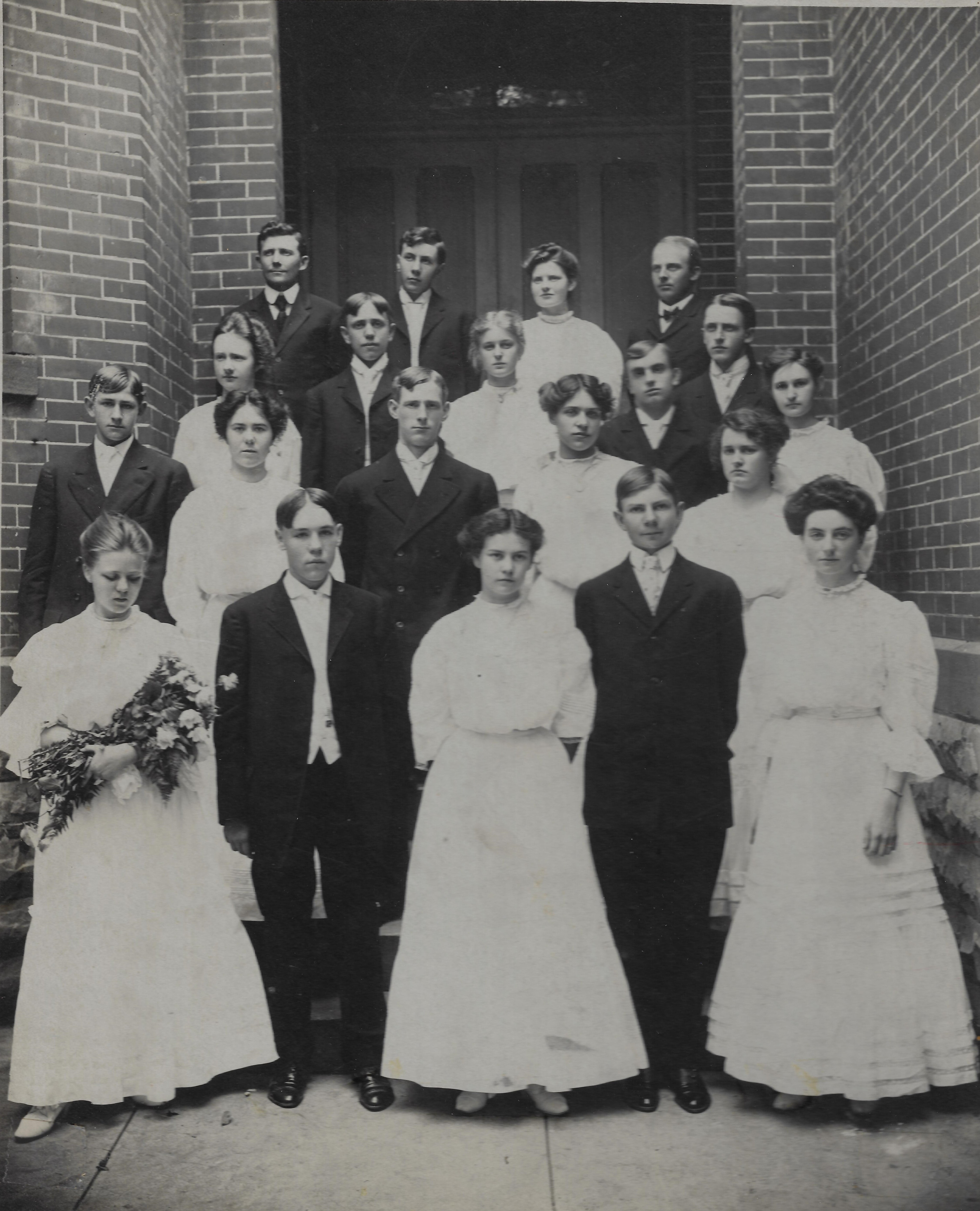 This photograph of the Worthington High School Class of 1906 appears to have been taken on the steps of the high school at the time of graduation. The people in the photograph have been identified as follows: Top row: J.J. McDonald (teacher), John Rugg, Martha Davis Welling, Harvey Gruver (Superintendent); 2nd row: Lucile Brand, Harry Warsmith, Marie Pingree, Burdette Keys, Harry Moore; 3rd row: Hadley McIlvaine, Ethel Kirker, Gordon Pinney, Helen Williams, Roxy McGurer, Myrtle Fairman; 4th row: Hazel Williams, Hubert Killian, Ila Beaver, Ellis Gardner, Otta Snouffer.