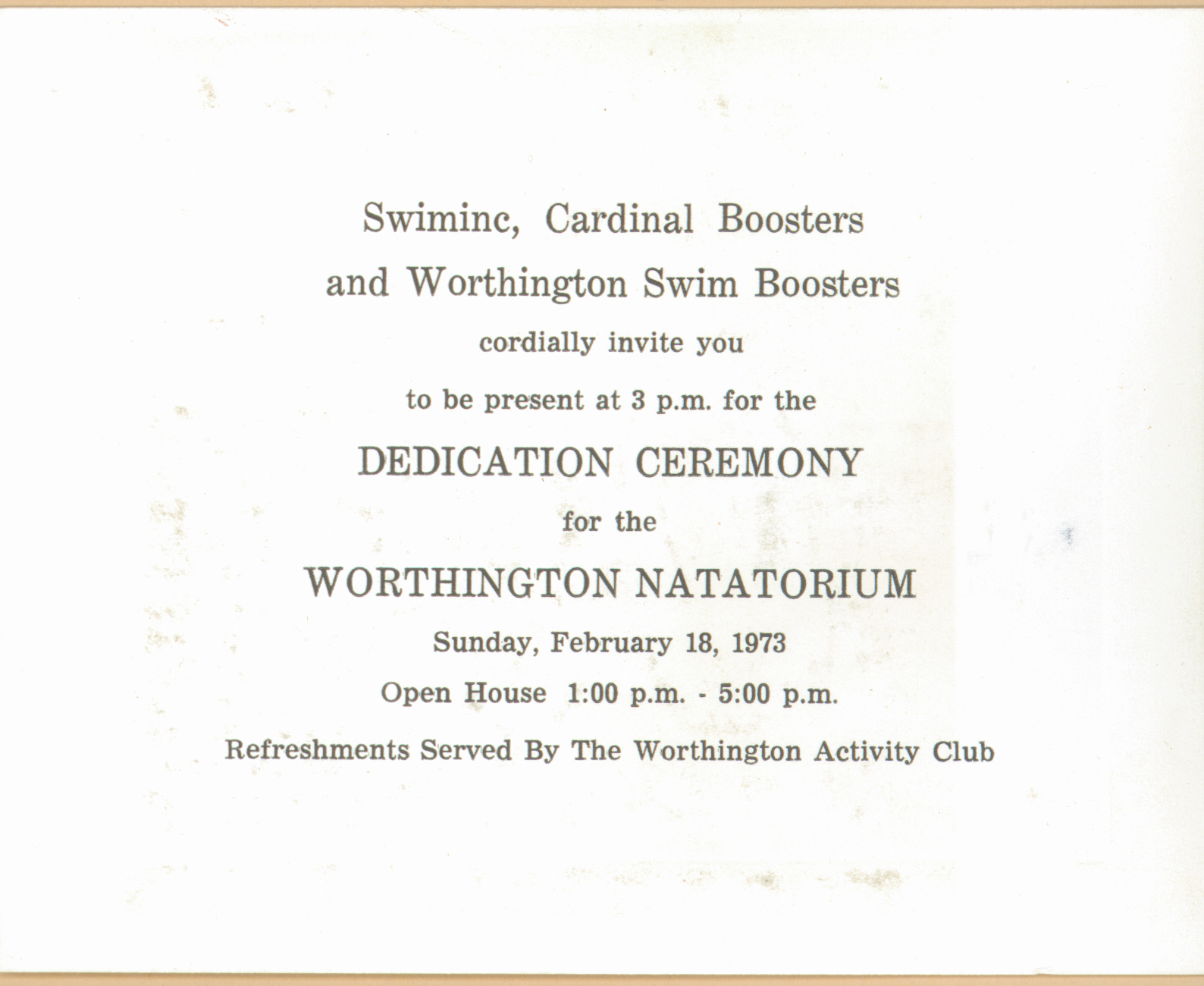 The open house and dedication ceremony of the Worthington Natatorium was held on February 18, 1973. The indoor swimming pool was dedicated to the youth of Worthington in memory of David Burt and Charles Shupe. Burt and Shupe, members of the Worthington High School swim team, were victims of a traffic accident that took their lives in 1966. A plaque dedicated to their memory was placed near the entrance of the facility. The open house, sponsored by Swiminc, the Cardinal Boosters, and Worthington Swim Boosters featured swim team races, scuba diving demonstrations, and high diving exhibitions.