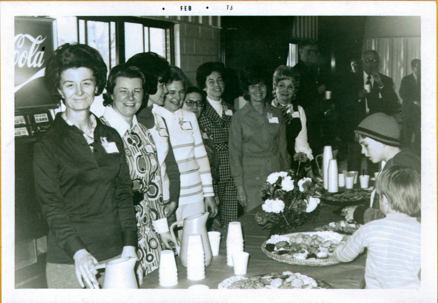 Pictured here are members of the Activity Club at the open house and dedication ceremony of the Worthington Natatorium. The indoor swimming pool, dedicated to the youth of Worthington in memory of David Burt and Charles Shupe opened in February 1973. David Burt and Charles Shupe were members of the Worthington High School swim team who lost their lives in a traffic accident 1966. The open house and dedication ceremony were sponsored by Swiminc, the Cardinal Boosters, and Worthington Swim Boosters. The event featured the Worthington High School swim team, scuba diving demonstrations, and high diving exhibitions. The Activity Club provided refreshments for the event.